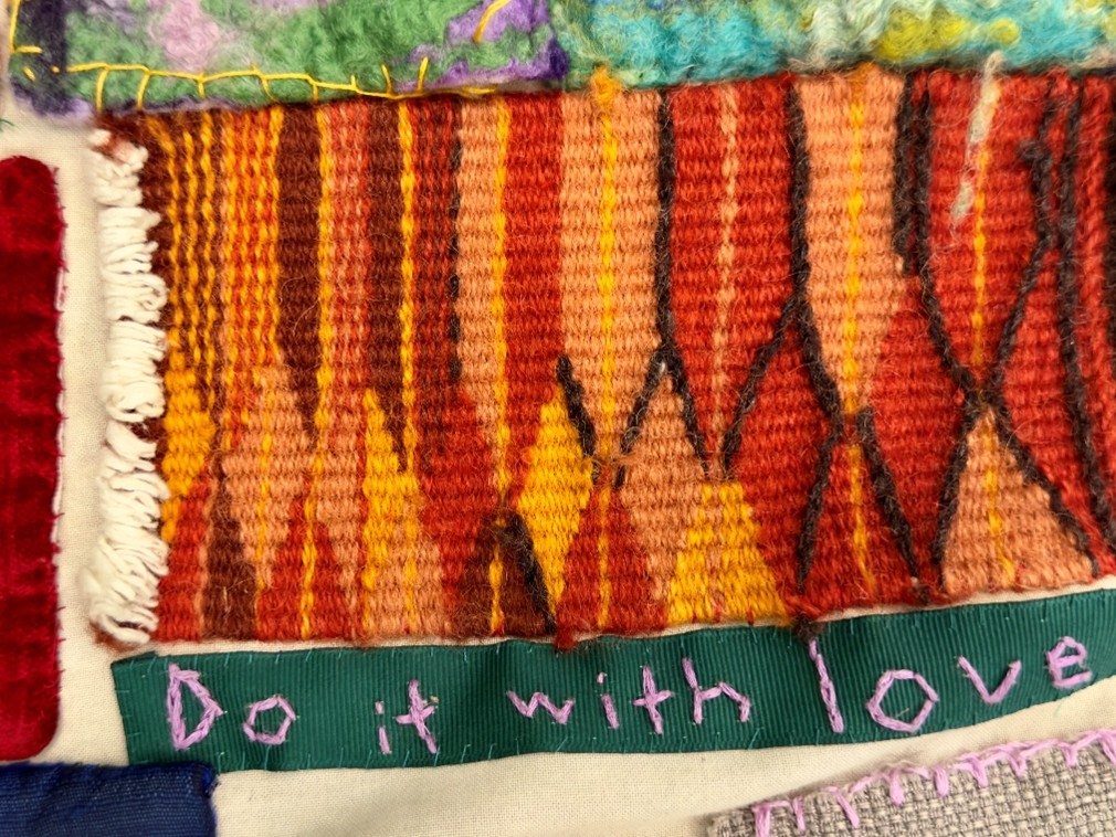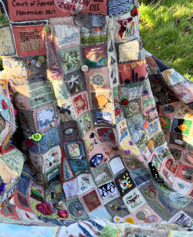 As Barbara says, it is a moving piece of collective art: “to warm you with a sense of what to do, to carry your voice. Only by many hands can such a coat be made, stitched, and joined on a journey, like a living fable, travelling on many backs.”